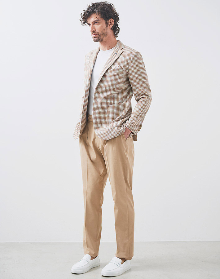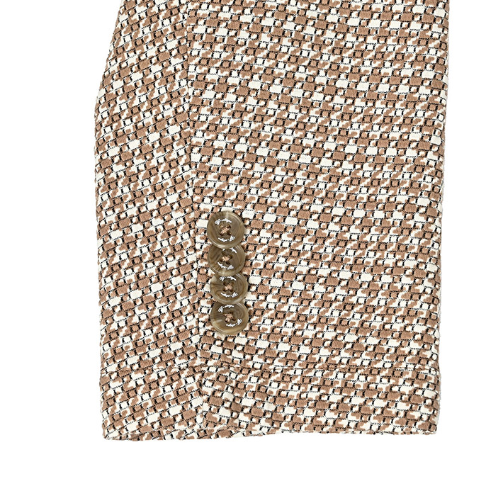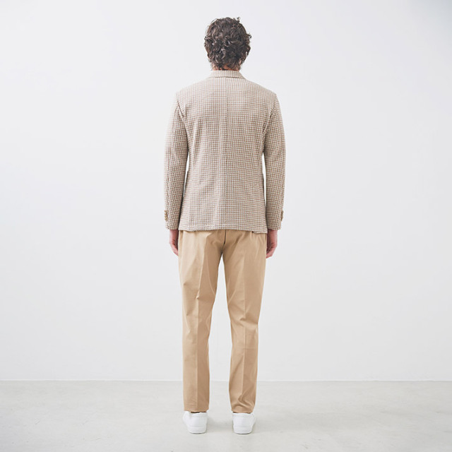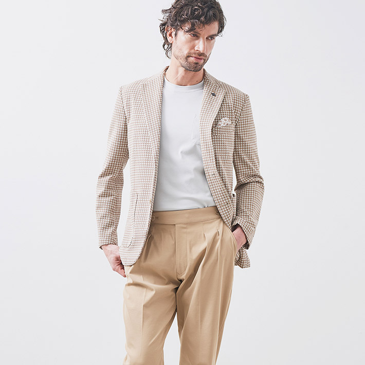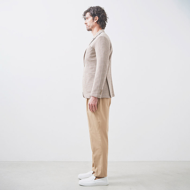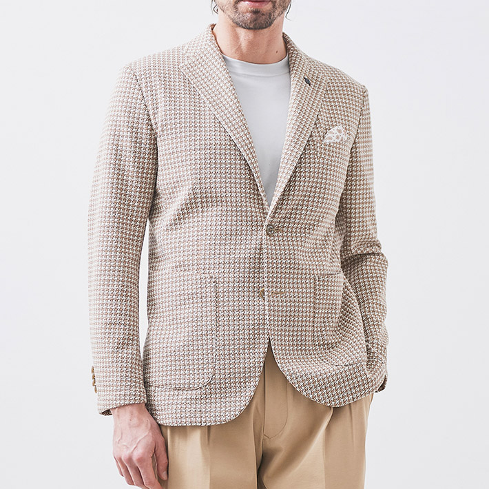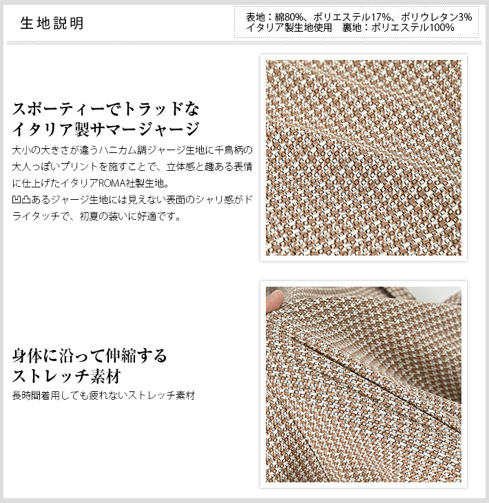 HOMEITEM JACKETS ジャケット 春夏 ブラウンの千鳥柄がトラッドで大人っぽいイタリアンジャージジャケット ROMA 千鳥プリントジャージジャケット イタリア製生地 150211 G-STAGE ジーステージ 価格: ¥49,500 (税込) 販売期間: カラー: 選択してください ベージュ サイズ: 選択してください 46 48 50 数量: 枚 カラーサイズ在庫ベージュ46○48×50○ __MEMBER_ID__ ROMA千鳥プリントジャージジャケット150211 ブラウンの千鳥柄がトラッドで大人っぽいイタリアンジャージジャケットハニカム組織の軽量ジャージ生地に、トラッドなブラウンベージュのハウンドトゥース柄を施したサマージャージジャケット。大小の大きさが違うハニカム調ジャージ生地に千鳥柄の大人っぽいプリントを施すことで、立体感と趣ある表情に仕上げました。生地はイタリアROMA社製。凹凸あるジャージ生地には見えない表面のシャリ感がドライタッチで、初夏の装いに好適です。伸縮性ある生地なので、長時間着用しても疲れないのも魅力。デザインは背抜き&裏地なしのライトな着用感を重視した仕立てと、カジュアルなパッチポケット。スポーティーなジャージ素材にブラウン×ベージュのトラッドで大人っぽい千鳥柄。相反するテイストをかけ合わせて、ドレスとカジュアルの絶妙なバランスを表現するG-stageらしい大人仕様のジャケットです。 生地の厚さ 薄いやや薄い普通やや厚い厚い 裏地 あり なし 透け感 あり なし 伸縮性 あり なし 光沢 なし あり お手入れ方法 当て布使用 お手入れ方法のアイコンについて フロントベーシックなテーラード襟背裏と同素材のチーフが付きます裏側軽快さを重視したライトな仕立て袖シンプルな筒袖と飾り重ねボタンポケット両腰パッチポケットボタンマーブル調のオリジナルボタンベント軽快なサイドベントブランドアイコン蜂をモチーフにしたアイコン"fortunate bee"ブランドプレート サイズ肩幅 胸囲 着丈 袖丈 胴囲 裾囲 ラペル幅 46(M相当) 45 104 70 60.5 94 106 8.5 48(L相当) 46 108 71 61.5 98 110 8.8 50(XL相当) 47 112 72 62.5 102 114 8.8 ※単位はcmです。※サイズ表より前後2cmは誤差の許容範囲とさせて頂いております。 サイズ表はこちら ROMA 千鳥プリントジャージジャケット イタリア製生地 150211 G-STAGE ジーステージ 価格: ¥49,500 (税込) 販売期間: カラー: 選択してください ベージュ サイズ: 選択してください 46 48 50 数量: 枚 カラーサイズ在庫ベージュ46○48×50○ サイズ上のご注意点 サイズ表記は、商品本体のサイズになります。(ヌードサイズではございません) サイズにつきましては、お手元の衣類と本サイズを合わせて下さい。商品の素材等によっては、多少サイズに誤差が生じる場合がございます。当店では前後2cmは誤差の範囲内とさせて頂いておりますので、予めご了承くださいませ。 他にお困りでしたら当店までご連絡をお願いします。 在庫につきまして 当店では、実店舗 並びに自社サイトと在庫を共有しておりますので、オーダー受付後売り違いによる完売、欠品となってしまう場合もございます。 その際は、ご注文確認メール後に再度、当店よりご連絡させて頂きますことを予めご了承下さいませ。 商品画像について 商品画像の一部は、屋内照明の下で撮影していますので撮影商品画像と実際の商品と若干の色合いに違いが生じる場合がございます。 またコンピューターディスプレイの環境によっても異なる場合がございますので、予めご了承下さいませ。