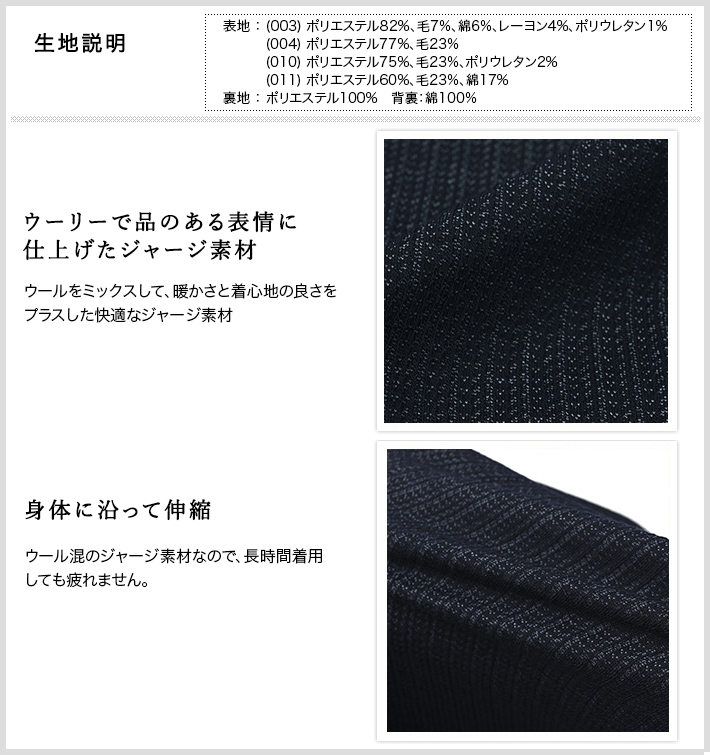 HOMEITEM JACKETS ジャケット 秋冬 ウーリーな大人の品に心地良さをプラスしたウールジャージのジャケット[別売り セットアップパンツ 240501] ウールミックス ストレッチ ジャージジャケット セットアップ 別売り 秋冬 240201 G-stage ジーステージ 価格: ¥24,200 (税込) [ポイント還元 242ポイント~] 販売期間: カラー: 選択してください ライトグレー チャコールグレー ネイビー 千鳥ブラック サイズ: 選択してください 44 46 48 50 数量: 枚 カラーサイズ在庫ライトグレー44○46○48○50残り3点以下チャコールグレー44○46○48○50○ネイビー44○46○48○50○千鳥ブラック44残り3点以下46○48○50○ __MEMBER_ID__ ウールミックスストレッチジャージジャケット240201 ウーリーな大人の品に心地良さをプラスしたウールジャージのジャケットウール混のウォーム感と品ある面持ちに、ジャージ素材の快適な着用感をプラスした、ウールミックスジャージジャケット。今季はトラッドな色柄に、深みあるパターンをミックスした"モダンでトラッド"な表情が新鮮。ほど良い肉厚感のウール混素材で、高級感と大人の品ある表情でありながら、体に沿って伸縮する快適な着心地を併せ持ったジャケットです。大人に相応しいクラシックな色柄をG-stageらしいカラーで表現し、ウーリーで立体感ある面持ちに仕上げました。ウール混でありながらピリングがおきにくい品質も魅力です。デザインはやや高めのゴージラインでスマートな面持。着心地の良さを重視したライトな仕立てなので、軽やかにご着用いただけます。同素材のパンツ(品番:240501)を合わせてセットアップでドレッシーにこなすのも良し、ジーンズやチノパンなどを合わせたジャケパンスタイルでカジュアルに着流すのもお奨めです。ベーシックなテーラードジャケットのデザインなので、ON-OFF自在に着回せるコストパフォーマンスの高さも魅力。まさに、クラシックとカジュアルを融合させたG-stageを象徴するアイコニックなジャケットです。≫ 別売りセットアップパンツ(品番:240501)はこちら≫ 同素材ダブルジャケット(品番:240212)はこちら 生地の厚さ 薄いやや薄い普通やや厚い厚い 裏地 あり なし 透け感 あり なし 伸縮性 あり なし 光沢 なし あり お手入れ方法 当て布使用 お手入れ方法のアイコンについて フロント襟ベーシックなテーラードタイプ裏側着心地の良さを重視したライトな仕立て袖カジュアルな筒袖仕様ポケットカジュアルなフラップポケットボタンオリジナルの刻印入りボタンベント軽快に着用できるサイドベンツアイコンプレートフラワーホールの下に蜂をモチーフ にしたブランドアイコンプレート"fortunate bee"ポケットチーフ背裏生地と同生地のポケットチーフ付内ポケット両身頃の内側にもポケット サイズ肩幅 胸囲 着丈 袖丈 胴囲 裾囲 44(S相当) 44 101 70 60.5 91 103 46(M相当) 45 104 70 60.5 94 106 48(L相当) 46 108 71 61.5 98 110 50(XL相当) 47 112 72 62.5 102 114 ※単位はcmです。※サイズ表より前後2cmは誤差の許容範囲とさせて頂いております。 サイズ表はこちら ウールミックス ストレッチ ジャージジャケット セットアップ 別売り 秋冬 240201 G-stage ジーステージ 価格: ¥24,200 (税込) [ポイント還元 242ポイント~] 販売期間: カラー: 選択してください ライトグレー チャコールグレー ネイビー 千鳥ブラック サイズ: 選択してください 44 46 48 50 数量: 枚 カラーサイズ在庫ライトグレー44○46○48○50残り3点以下チャコールグレー44○46○48○50○ネイビー44○46○48○50○千鳥ブラック44残り3点以下46○48○50○ サイズ上のご注意点 サイズ表記は、商品本体のサイズになります。(ヌードサイズではございません) サイズにつきましては、お手元の衣類と本サイズを合わせて下さい。商品の素材等によっては、多少サイズに誤差が生じる場合がございます。当店では前後2cmは誤差の範囲内とさせて頂いておりますので、予めご了承くださいませ。 他にお困りでしたら当店までご連絡をお願いします。 在庫につきまして 当店では、実店舗 並びに自社サイトと在庫を共有しておりますので、オーダー受付後売り違いによる完売、欠品となってしまう場合もございます。 その際は、ご注文確認メール後に再度、当店よりご連絡させて頂きますことを予めご了承下さいませ。 商品画像について 商品画像の一部は、屋内照明の下で撮影していますので撮影商品画像と実際の商品と若干の色合いに違いが生じる場合がございます。 またコンピューターディスプレイの環境によっても異なる場合がございますので、予めご了承下さいませ。 関連商品 [会員様限定OUTLET SALE]在庫限り ハイテンション コーデュロイ ストレッチパンツ G-stage ジーステージ メーカー希望小売価格: ¥15,400(税込) ¥6,930(税込) 商品を見る [会員様限定OUTLET SALE]在庫限り コーデュロイジャケット ハイテンション コーデュロイ ストレッチ ジャケット 420207 G-stage ジーステージ メーカー希望小売価格: ¥20,900(税込) ¥9,900(税込) 商品を見る [会員限定SALE]ダウン&ハニカムジ
