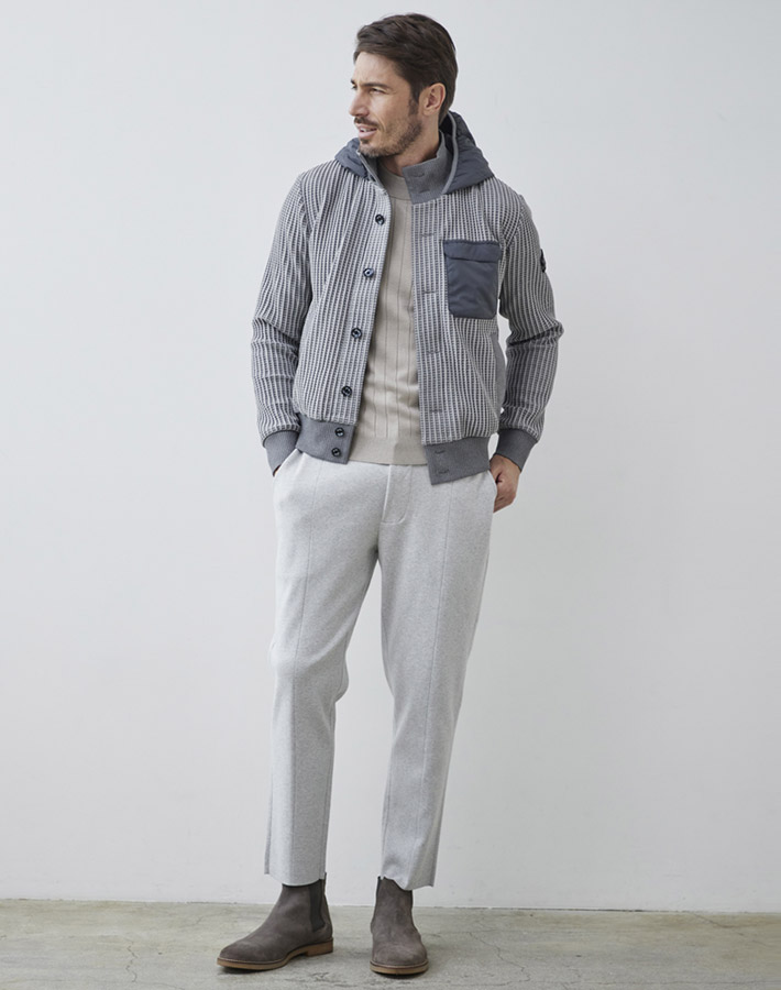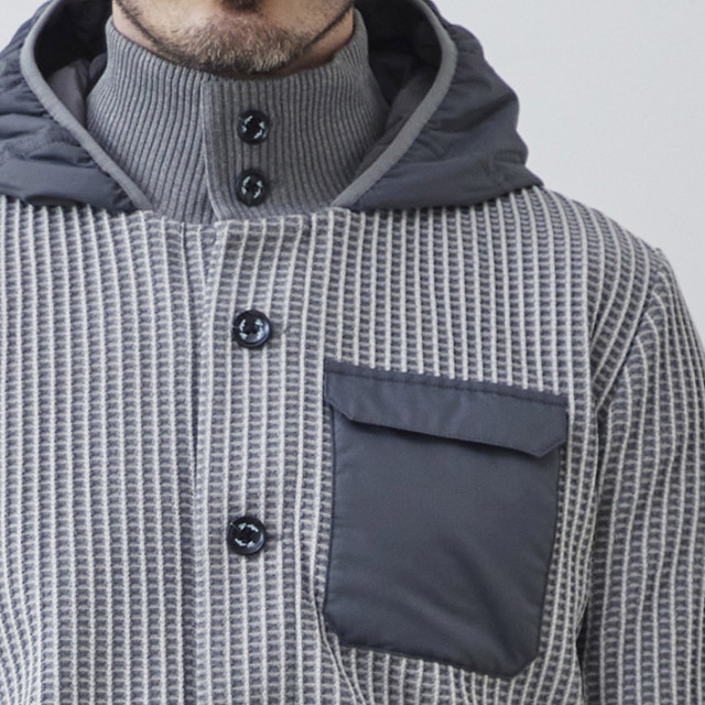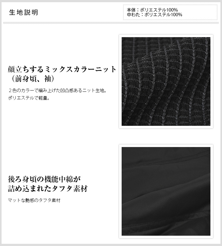 HOMEITEM OUTER アウター 秋冬 高機能中綿とニットの軽量異素材コンビブルゾン バックキルト ニットコンビ フーデッド ブルゾン 240411 G-STAGE ジーステージ 価格: ¥25,300 (税込) [ポイント還元 253ポイント~] 販売期間: カラー: 選択してください ライトグレー ブラック サイズ: 選択してください 46 48 50 数量: 枚 カラーサイズ在庫ライトグレー46○48○50○ブラック46○48○50○ __MEMBER_ID__ バックキルトニットコンビフーデッドブルゾン240411 高機能中綿とニットの軽量異素材コンビブルゾン前身頃と袖をニット、後ろ身頃は高機能中綿に切り替えた軽量異素材コンビブルゾン。中綿部分にはデュポン社が開発した高機能素材SORONA AURAを使用。SORONA AURAは同じ厚みのあるポリエステルの中綿は勿論、ダウンすらも凌駕する抜群の保温性、耐久性を兼ね備えた素材。柔らかく柔軟性があり形態保持性もあるため、型崩れがしにくく、軽量で通気性があり、暖かいのが特徴。 ダウンと違い湿気等に強く、防水性がある為、ダウンよりも厳しい環境に強いタフな中綿です。ニット部分は2色のミックスカラーで編み上げた凹凸ある表情で、1着で顔立ちするアウターに仕上げました。フロントはファスナーではなくボタンアップを採用することで、大人っぽさもプラスしています。中綿を後ろ身頃に配することで着膨れすることなく、スマートに着こなしていただけるのが特徴で、真冬にはインナーにも活躍する万能ブルゾンです。 生地の厚さ 薄いやや薄い普通やや厚い厚い 裏地 あり なし 透け感 あり なし 伸縮性 あり なし 光沢 なし あり お手入れ方法 当て布使用 お手入れ方法のアイコンについて フロントリブ素材のボタンアップとフードが一体化したネック部分裏側全面に裏地が配されているので防寒性も〇ポケットポケット口にリブの切り替え袖ソフトにフィットするリブ袖胸ポケット左胸に異素材のフラップポケットボタンオリジナルのマーブル調ボタン裾ソフトにフィットするリブ裾内ポケット左内側にファスナー付きポケットアイコン左腕のアイコン サイズ肩幅 胸囲 着丈 袖丈 裄丈 胴囲 裾囲 46(M相当) 44 100 62 63 85 92 78 48(L相当) 45 108 63 64 86.5 100 86 50(XL相当) 46 116 64 65 88 108 94 ※単位はcmです。※サイズ表より前後2cmは誤差の許容範囲とさせて頂いております。 サイズ表はこちら バックキルト ニットコンビ フーデッド ブルゾン 240411 G-STAGE ジーステージ 価格: ¥25,300 (税込) [ポイント還元 253ポイント~] 販売期間: カラー: 選択してください ライトグレー ブラック サイズ: 選択してください 46 48 50 数量: 枚 カラーサイズ在庫ライトグレー46○48○50○ブラック46○48○50○ サイズ上のご注意点 サイズ表記は、商品本体のサイズになります。(ヌードサイズではございません) サイズにつきましては、お手元の衣類と本サイズを合わせて下さい。商品の素材等によっては、多少サイズに誤差が生じる場合がございます。当店では前後2cmは誤差の範囲内とさせて頂いておりますので、予めご了承くださいませ。 他にお困りでしたら当店までご連絡をお願いします。 在庫につきまして 当店では、実店舗 並びに自社サイトと在庫を共有しておりますので、オーダー受付後売り違いによる完売、欠品となってしまう場合もございます。 その際は、ご注文確認メール後に再度、当店よりご連絡させて頂きますことを予めご了承下さいませ。 商品画像について 商品画像の一部は、屋内照明の下で撮影していますので撮影商品画像と実際の商品と若干の色合いに違いが生じる場合がございます。 またコンピューターディスプレイの環境によっても異なる場合がございますので、予めご了承下さいませ。 関連商品 [会員様限定 在庫限りSALE] ダウン&ハニカムジャージ コンビデザインパンツ ゴルフウェア 210506 420518 G-STAGE ジーステージ メーカー希望小売価格: ¥21,780(税込) ¥7,700(税込) 商品を見る