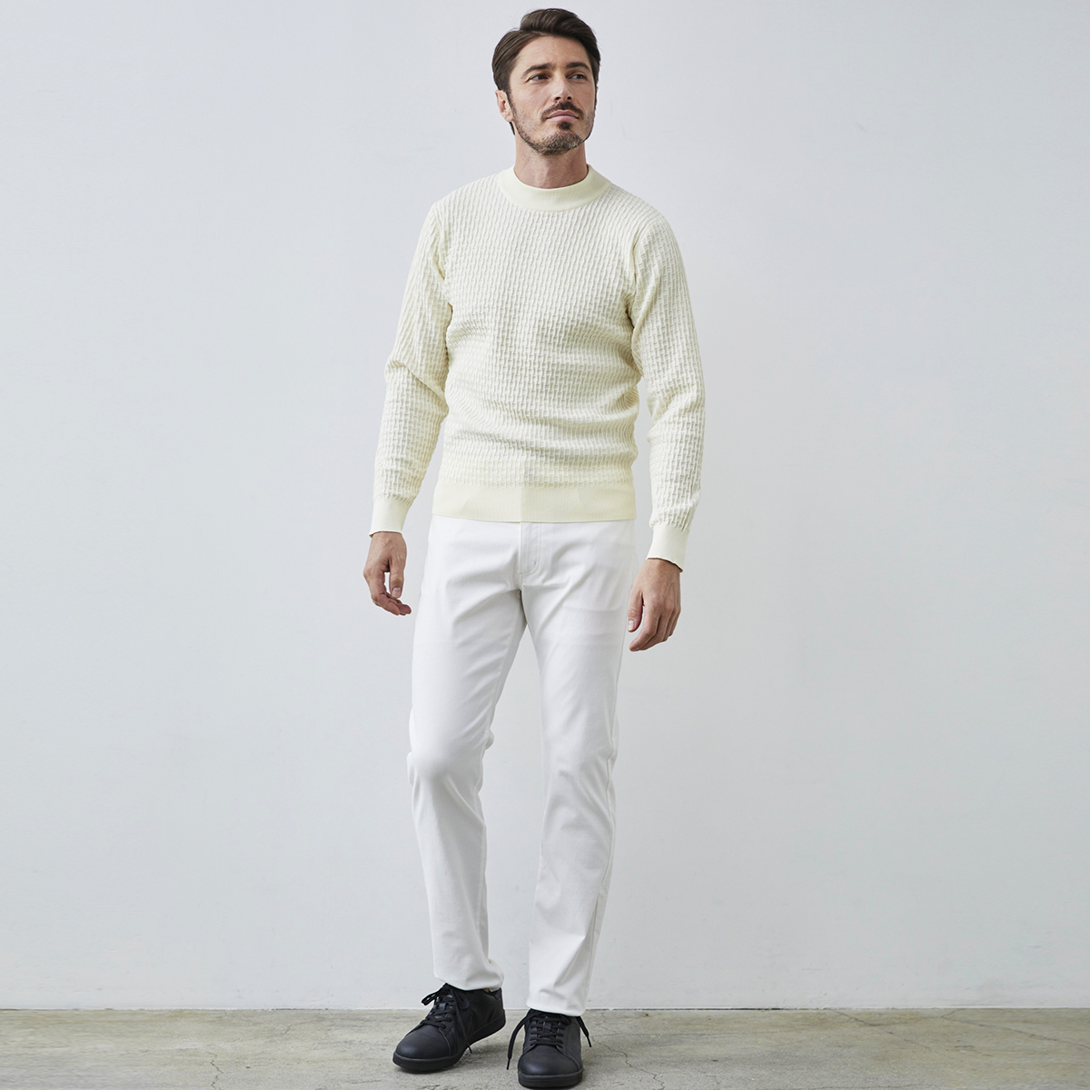 HOMEITEM PANTS パンツ 秋冬 高いストレッチ性でシーズンフリーなシンプルツイルパンツ ストレッチツイルパンツ ウエストストレッチ 美脚パンツ 240533-1 240532 G-stage ジーステージ 価格: ¥6,490 (税込) [ポイント還元 64ポイント~] 販売期間: カラー: 選択してください (No.101)ホワイト (No.105)ベージュ (No.110)ネイビー (No.111)ブラック (No.203)ライトグレー (No.204)チャコールグレー (No.211)千鳥ブラック (No.001)ホワイト (No.004)チャコールグレー (No.010)ネイビー (No.011)ブラック サイズ: 選択してください 44 46 48 50 [裾上げ希望]: お裾上げ方法を下のプルダウンより選択ください。 お裾上げをご希望の方は、購入手続き画面の 「お裾上げ 股下サイズ」に股下サイズを合わせてご記入ください。 お裾上げ後の返品・交換はお受けできません。 仕上がりはご注文承諾より1週間程度お時間頂戴いたします。 ※お裾上げの必要がない場合は、「裾上げなし」をご選択ください。 選択してください 裾上げなし(¥0) デニム仕上げ(¥1,100) シングル仕上げ(¥1,100) ダブル仕上げ(¥1,100) 数量: 枚 カラーサイズ在庫(No.101)ホワイト44○46○48○50○(No.105)ベージュ44○46○48○50× (No.110)ネイビー44○46○48○50× (No.111)ブラック44残り3点以下46残り3点以下48○50残り3点以下(No.203)ライトグレー44○46○48○50○(No.204)チャコールグレー44○46○48○50○(No.211)千鳥ブラック44○46○48残り3点以下50× (No.001)ホワイト44× 46× 48残り3点以下50× (No.004)チャコールグレー44× 46× 48○50○(No.010)ネイビー44× 46× 48× 50× (No.011)ブラック44× 46× 48× 50× __MEMBER_ID__ 素材■ ストレッチオペロン本体:(No.101,105,110,111) レーヨン50%、ポリエステル24%、ナイロン22%、ポリウレタン4%(No.203,204) レーヨン50%、ポリエステル26%、ナイロン20%、ポリウレタン4%(No.211) レーヨン54%、ポリエステル43%、ポリウレタン3% サイズウエスト 股上 股下 ワタリ幅 裾幅 ヒップ 44(S相当) 77 22.5 75 31 17 95 46(M相当) 81 23 75 32 17.5 99 48(L相当) 85 23.5 78 33 18 103 50(XL相当) 89 24 78 34 18.5 107 ■ ストレッチインベル本体:(No.001,011) レーヨン75%、ナイロン22%、ポリウレタン3%(No.004,110) ポリエステル48%、レーヨン26%、ナイロン22%、ポリウレタン4% サイズウエスト 股上 股下 ワタリ幅 裾幅 ヒップ 44(S相当) 77 23.5 76 30 17 96 46(M相当) 81 24 76 31 17.5 100 48(L相当) 85 24.5 79 32 18 104 50(XL相当) 89 25 79 33 18.5 108 ※単位はcmです。※サイズ表より前後2cmは誤差の許容範囲とさせて頂いております。 サイズ表はこちら 生地の厚さ 薄いやや薄い普通やや厚い厚い 裏地 あり なし 透け感 あり なし 伸縮性 あり なし 光沢 なし あり お手入れ方法 当て布使用 お手入れ方法のアイコンについて 高いストレッチ性でシーズンフリーなシンプルツイルパンツ高いストレッチ性とハリ感が魅力のポンチニットを使用した、シーズンフリーで活躍するコンフォートパンツです。ドレープ感ある柔らかく丈夫なツイル素材に、適度な可動域をサポートする伸縮素材が特徴。まるでスウェットのような楽な履き心地ながら、上品なハリ感と洗濯しても型崩れしにくい耐久性を兼ね備えています。カジュアルからキレイめ、そしてフォーマルなシーンまで対応できる万能さがポイント。汚れが付きにくい生地なので、アクティブな毎日にも安心して着用いただけます。ウエストは締め付け感のない伸縮性のあるウエスト芯(インサイドベルト)で約7cmの可動域があり、長時間の着用でもストレスを感じません。高機能でスタイリッシュ。オンオフを問わず、毎日を快適に彩る万能パンツです。 サイズ上のご注意点 サイズ表記は、商品本体のサイズになります。(ヌードサイズではございません) サイズにつきましては、お手元の衣類と本サイズを合わせて下さい。 商品の素材等によっては、多少サイズに誤差が生じる場合がございます。 (当店では前後2cmは誤差の範囲内とさせて頂いております。) 在庫につきまして 当店では実店舗、並びに複数のECサイトと在庫を共有しております。 そのため、在庫システムの反映のタイミングによっては、ご注文いただいたにも関わらず商品が完売・欠品している場合がございます。 その際は、ご注文確認メール後に再度当店よりご連絡させて頂きます。 商品画像について 商品画像の一部は、自然光や屋内照明の影響により、実際の商品と色味が若干異なって見える場合がございます。 お客様がお使いのデバイス(スマートフォン、PC、タブレットなど)の環境によっても、色の見え方が異なる可能性がございます。 商品番号について 商品番号、カラー番号は生産管理上の番号でございますので、商品ページ記載の番号と、実際の商品の下げ札・ネームの番号が異なる場合がございます。 ストレッチツイルパンツ ウエストストレッチ 美脚パンツ 240533-1 240532 G-stage ジーステージ 価格: ¥6,490 (税込) [ポイント還元 64ポイント~] 販売期間: カラー: 選択してください (No.101)ホワイト (No.105)ベージュ (No.110)ネイビー (No.111)ブラック (No.203)ライトグレー (No.204)チャコールグレー (No.211)千鳥ブラック (