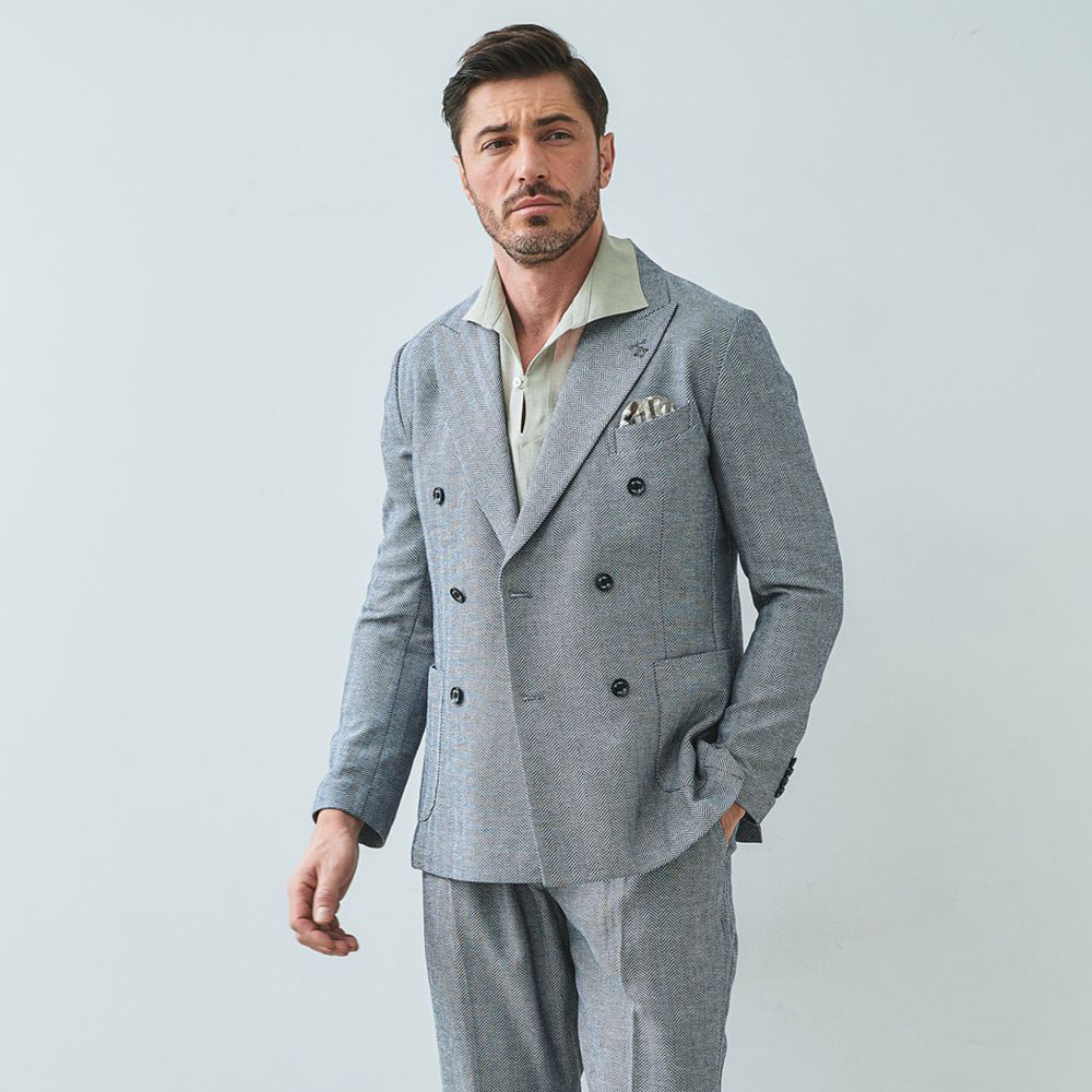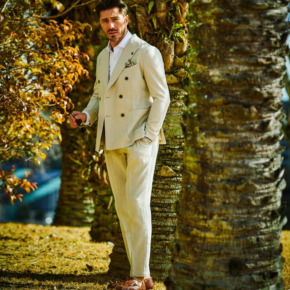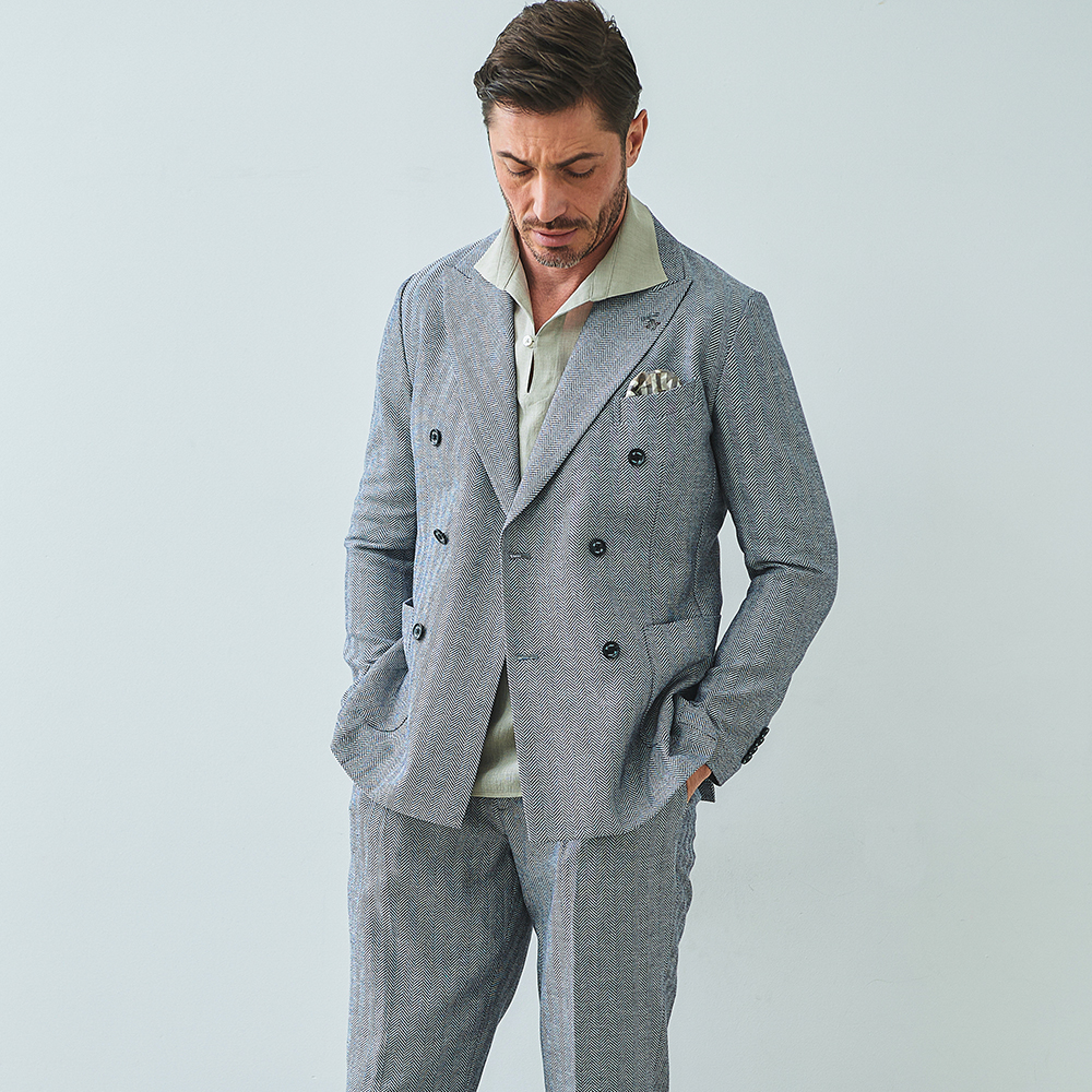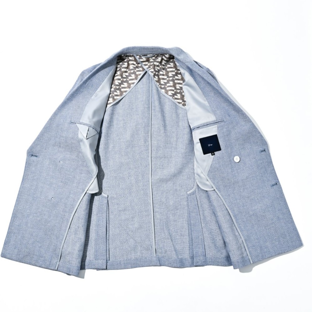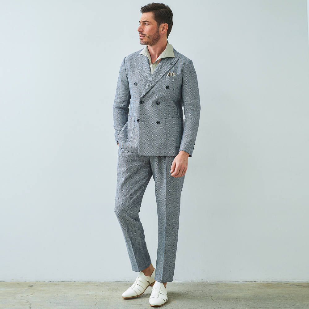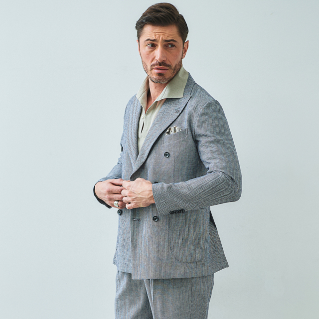 HOMEBRANDS G-STAGE ジーステージ ジャケット 清涼感のあるクラシカルなダブルブレストジャケット[セットアップスラックス別売り 360504/360505] コットンリネン ヘリンボーン ダブルジャケット 春 ドライ セットアップ対応 G-STAGE ジーステージ 360205 価格: ¥28,600 (税込) [ポイント還元 286ポイント~] 販売期間: カラー: 選択してください ベージュ サックス ネイビー サイズ: 選択してください 44 46 48 50 52 数量: 個 カラーサイズ在庫ベージュ44○46○48○50○52○サックス44○46○48○50○52×ネイビー44○46○48○50○52× __MEMBER_ID__ コットンリネンヘリンボーンダブルジャケット360205 FEATURE MOVIE B.R.CHANNEL 紹介動画 B.R.CHANNELでご紹介いただいたこの夏おすすめのアイテムを 動画でご覧いただけます。 清涼感のあるクラシカルなダブルブレストジャケットリネンのシャリ感とコットンのハリ感を掛け合わせた、清涼感あふれるドライタッチジャケット。コットンリネンの涼やかな質感はそのままに、汗ばむ季節でも肌離れが良く、ベタつきを感じさせないサラリとした着心地を実現しました。表情豊かなヘリンボーンの織り柄にシャンブレー調の色合いが重なり、見た目にも涼し気な印象です。[特徴]・通気性の良いドライな肌触り・シャンブレー調の奥行きのある色合い・綿混の適度な厚みとハリ感・リネン混の表情豊かなネップ感・ナチュラルストレッチでノンストレスな可動域デザインはクラシカルで品のあるダブルブレストを採用。エレガントな面持ちながら、着心地の良さを重視したライトな仕立てです。ヘリンボーンとシャンブレー調の柄行きは、セットアップでドレッシーに着こなすもよし、ジーンズやチノパンなどを合わせたジャパンスタイルでカジュアルに着流すのもおすすめです。同素材のセットアップパンツは、グルカパンツ(品番:360505)とワンタックパンツ(品番:360504)をご用意。品のある大人のセットアップスタイルをお楽しみください。 生地の厚さ 薄いやや薄い普通やや厚い厚い 裏地 あり なし 透け感 あり なし 伸縮性 ややあり なし 光沢 なし あり お手入れ方法 当て布使用 お手入れ方法のアイコンについて フロント襟クラシカルなダブルブレストのテーラードデザイン背裏生地と同生地のポケットチーフ付裏側着心地の良さを重視したライトな仕立て背裏あり、内ポケット2つあり袖・ポケットシンプルな筒袖と両腰にパッチポケット背面スマートなバックスタイルと軽快なサイドベンツ サイズ肩幅 胸囲 着丈 袖丈 胴囲 裾囲 ラペル幅 44(S相当) 44 101 70 60.5 91 103 10.2 46(M相当) 45 104 70 60.5 94 106 10.2 48(L相当) 46 108 71 61.5 98 110 10.5 50(XL相当) 47 112 72 62.5 102 114 10.5 52(XXL相当) 48 116 73 62.5 106 118 10.5 ※単位はcmです。※サイズ表より前後2cmは誤差の許容範囲とさせて頂いております。 サイズ表はこちら コットンリネン ヘリンボーン ダブルジャケット 春 ドライ セットアップ対応 G-STAGE ジーステージ 360205 価格: ¥28,600 (税込) [ポイント還元 286ポイント~] 販売期間: カラー: 選択してください ベージュ サックス ネイビー サイズ: 選択してください 44 46 48 50 52 数量: 個 カラーサイズ在庫ベージュ44○46○48○50○52○サックス44○46○48○50○52×ネイビー44○46○48○50○52× サイズ上のご注意点 サイズ表記は、商品本体のサイズになります。(ヌードサイズではございません) サイズにつきましては、お手元の衣類と本サイズを合わせて下さい。商品の素材等によっては、多少サイズに誤差が生じる場合がございます。当店では前後2cmは誤差の範囲内とさせて頂いておりますので、予めご了承くださいませ。 他にお困りでしたら当店までご連絡をお願いします。 在庫につきまして 当店では、実店舗 並びに自社サイトと在庫を共有しておりますので、オーダー受付後売り違いによる完売、欠品となってしまう場合もございます。 その際は、ご注文確認メール後に再度、当店よりご連絡させて頂きますことを予めご了承下さいませ。 商品画像について 商品画像の一部は、屋内照明の下で撮影していますので撮影商品画像と実際の商品と若干の色合いに違いが生じる場合がございます。 またコンピューターディスプレイの環境によっても異なる場合がございますので、予めご了承下さいませ。 商品番号について 商品番号、カラー番号は生産管理上の番号でございますので、ネット上の番号とは異なる場合がございます。 商品ページ記載の番号と、商品の下げ札・ネームの番号が異なる場合でも、商品に間違いはございませんのでご安心ください。