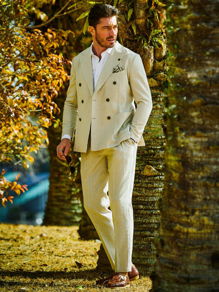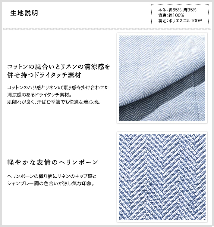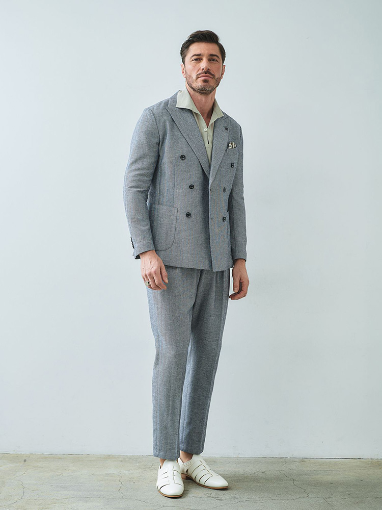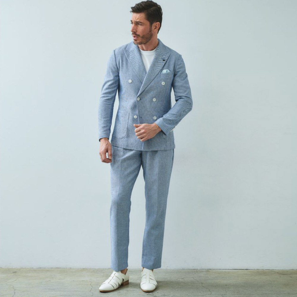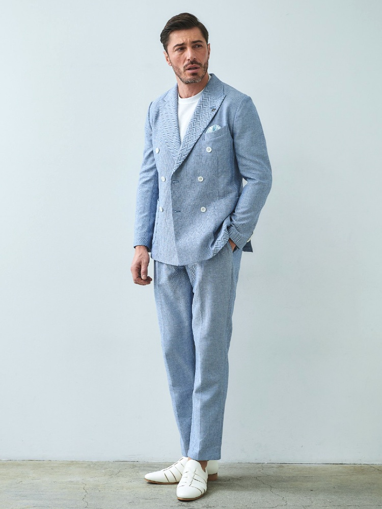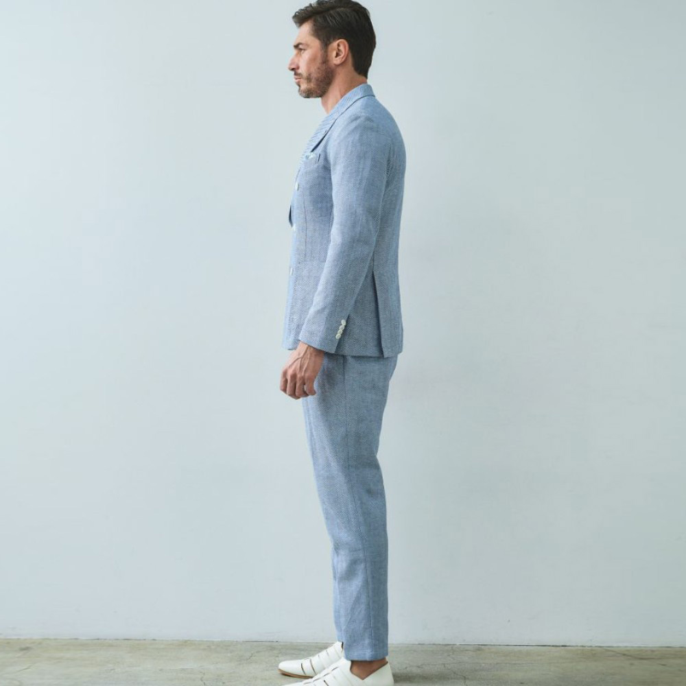 HOMEBRANDS G-STAGE ジーステージ ジャケット 清涼感のあるクラシカルなダブルブレストジャケット[セットアップスラックス別売り 360504/360505] コットンリネン ヘリンボーン ダブルジャケット 春 ドライ セットアップ対応 G-STAGE ジーステージ 360205 価格: ¥28,600 (税込) [ポイント還元 286ポイント~] 販売期間: カラー: 選択してください ベージュ サックス ネイビー サイズ: 選択してください 44 46 48 50 52 数量: 個 カラーサイズ在庫ベージュ44○46○48○50○52○サックス44○46○48○50○52×ネイビー44○46○48○50○52× __MEMBER_ID__ コットンリネンヘリンボーンダブルジャケット360205 FEATURE MOVIE B.R.CHANNEL 紹介動画 B.R.CHANNELでご紹介いただいたこの夏おすすめのアイテムを 動画でご覧いただけます。 清涼感のあるクラシカルなダブルブレストジャケットリネンのシャリ感とコットンのハリ感を掛け合わせた、清涼感あふれるドライタッチジャケット。コットンリネンの涼やかな質感はそのままに、汗ばむ季節でも肌離れが良く、ベタつきを感じさせないサラリとした着心地を実現しました。表情豊かなヘリンボーンの織り柄にシャンブレー調の色合いが重なり、見た目にも涼し気な印象です。[特徴]・通気性の良いドライな肌触り・シャンブレー調の奥行きのある色合い・綿混の適度な厚みとハリ感・リネン混の表情豊かなネップ感・ナチュラルストレッチでノンストレスな可動域デザインはクラシカルで品のあるダブルブレストを採用。エレガントな面持ちながら、着心地の良さを重視したライトな仕立てです。ヘリンボーンとシャンブレー調の柄行きは、セットアップでドレッシーに着こなすもよし、ジーンズやチノパンなどを合わせたジャパンスタイルでカジュアルに着流すのもおすすめです。同素材のセットアップパンツは、グルカパンツ(品番:360505)とワンタックパンツ(品番:360504)をご用意。品のある大人のセットアップスタイルをお楽しみください。 生地の厚さ 薄いやや薄い普通やや厚い厚い 裏地 あり なし 透け感 あり なし 伸縮性 ややあり なし 光沢 なし あり お手入れ方法 当て布使用 お手入れ方法のアイコンについて フロント襟クラシカルなダブルブレストのテーラードデザイン背裏生地と同生地のポケットチーフ付裏側着心地の良さを重視したライトな仕立て背裏あり、内ポケット2つあり袖・ポケットシンプルな筒袖と両腰にパッチポケット背面スマートなバックスタイルと軽快なサイドベンツ サイズ肩幅 胸囲 着丈 袖丈 胴囲 裾囲 ラペル幅 44(S相当) 44 101 70 60.5 91 103 10.2 46(M相当) 45 104 70 60.5 94 106 10.2 48(L相当) 46 108 71 61.5 98 110 10.5 50(XL相当) 47 112 72 62.5 102 114 10.5 52(XXL相当) 48 116 73 62.5 106 118 10.5 ※単位はcmです。※サイズ表より前後2cmは誤差の許容範囲とさせて頂いております。 サイズ表はこちら コットンリネン ヘリンボーン ダブルジャケット 春 ドライ セットアップ対応 G-STAGE ジーステージ 360205 価格: ¥28,600 (税込) [ポイント還元 286ポイント~] 販売期間: カラー: 選択してください ベージュ サックス ネイビー サイズ: 選択してください 44 46 48 50 52 数量: 個 カラーサイズ在庫ベージュ44○46○48○50○52○サックス44○46○48○50○52×ネイビー44○46○48○50○52× サイズ上のご注意点 サイズ表記は、商品本体のサイズになります。(ヌードサイズではございません) サイズにつきましては、お手元の衣類と本サイズを合わせて下さい。商品の素材等によっては、多少サイズに誤差が生じる場合がございます。当店では前後2cmは誤差の範囲内とさせて頂いておりますので、予めご了承くださいませ。 他にお困りでしたら当店までご連絡をお願いします。 在庫につきまして 当店では、実店舗 並びに自社サイトと在庫を共有しておりますので、オーダー受付後売り違いによる完売、欠品となってしまう場合もございます。 その際は、ご注文確認メール後に再度、当店よりご連絡させて頂きますことを予めご了承下さいませ。 商品画像について 商品画像の一部は、屋内照明の下で撮影していますので撮影商品画像と実際の商品と若干の色合いに違いが生じる場合がございます。 またコンピューターディスプレイの環境によっても異なる場合がございますので、予めご了承下さいませ。 商品番号について 商品番号、カラー番号は生産管理上の番号でございますので、ネット上の番号とは異なる場合がございます。 商品ページ記載の番号と、商品の下げ札・ネームの番号が異なる場合でも、商品に間違いはございませんのでご安心ください。