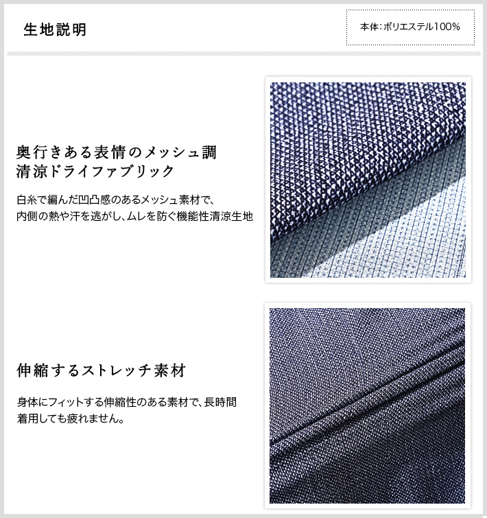 HOMEITEM PANTS パンツ 春夏 速乾ストレッチの快適メッシュ美脚パンツ[別売りセットアップジャケット 360202] 清涼ドライメッシュストレッチスラックス 春夏 セットアップ対応 ウォッシャブル G-STAGE ジーステージ 360502 価格: ¥13,200 (税込) [ポイント還元 132ポイント~] 販売期間: カラー: 選択してください グレー ブルー サイズ: 選択してください 44 46 48 50 52 [裾上げ希望]: お裾上げ方法を下のプルダウンより選択ください。 お裾上げをご希望の方は、購入手続き画面の 「お裾上げ 股下サイズ」に股下サイズを合わせてご記入ください。 お裾上げ後の返品・交換はお受けできません。 仕上がりはご注文承諾より1週間程度お時間頂戴いたします。 ※お裾上げの必要がない場合は、「裾上げなし」をご選択ください。 選択してください 裾上げなし(¥0) デニム仕上げ(¥1,100) シングル仕上げ(¥1,100) ダブル仕上げ(¥1,100) 数量: 枚 カラーサイズ在庫グレー44○46○48○50○52○ブルー44○46○48○50○52○ __MEMBER_ID__ 清涼ドライメッシュストレッチスラックス360502 通気性あふれる速乾ストレッチの清涼ドライメッシュスラックスメッシュ調の涼しく軽いプリント生地を使用し、見た目にも涼やかなシャープな面持ちの美脚ストレッチパンツ。通気性・速乾性に優れ、汗をかいても肌離れが良く、快適な着心地が持続。シワになりにくくストレッチ性と保形性がある軽量素材で、夏のゴルフシーンなど、アクティブに活躍します。[特徴]・内側の熱を逃がす高い通気性・梅雨時期にも便利な速乾性・肌に張り付かない爽快な着用感・シワが気にならないイージーケア・動きやすさをサポートする適度なストレッチ性・ご家庭で洗濯できるウォッシャブル仕様デザインは、美しくテーパードを描く美しいシルエットと、生地を縫い上げてセンタープリーツラインを形成した"永久プリーツ加工"で、どんなに動いても品のある表情がキープできます。ウエストはドローコードとベルトループを配しているので、ベルトなしのリラックススタイルからベルトをしてのドレッシーなスタイルまでカバー。シワを気にせず着用できるので、トラベルウェアにも好適。家庭洗濯可能なのでデイリーにご着用いただけます。同素材のジャケット(品番:360202)を合わせて、品のある大人のセットアップスタイルをお楽しみください。≫ 別売りセットアップジャケット(品番:360202)はこちら 生地の厚さ 薄いやや薄い普通やや厚い厚い 裏地 あり なし 透け感 あり なし 伸縮性 あり なし 光沢 なし あり お手入れ方法 洗濯の際ネット使用・無蛍光洗剤使用・当て布使用 お手入れ方法のアイコンについて ウエストベルトループとドローコードで2WAY仕様バックスタイル両側にポケット付きフロントシンプルなフロントと両サイドにスラントポケットセンタークリースライン縫い上げて形成している永久プリーツ仕様裾テーパードが際立つシンプルな仕上がりアイコンプレート左バックポケット横に蜂をモチーフにしたブランドアイコンプレート"fortunate bee" サイズウエスト 股上 股下 ワタリ幅 裾幅 ヒップ 44(S相当) 78 23 75 31 16 96 46(M相当) 82 23.5 75 32 16.5 100 48(L相当) 86 24 78 33 17 104 50(XL相当) 90 24.5 78 34 17.5 108 52(XXL相当) 94 25 78 35 18 112 ※単位はcmです。※サイズ表より前後2cmは誤差の許容範囲とさせて頂いております。 サイズ表はこちら 清涼ドライメッシュストレッチスラックス 春夏 セットアップ対応 ウォッシャブル G-STAGE ジーステージ 360502 価格: ¥13,200 (税込) [ポイント還元 132ポイント~] 販売期間: カラー: 選択してください グレー ブルー サイズ: 選択してください 44 46 48 50 52 [裾上げ希望]: お裾上げ方法を下のプルダウンより選択ください。 お裾上げをご希望の方は、購入手続き画面の 「お裾上げ 股下サイズ」に股下サイズを合わせてご記入ください。 お裾上げ後の返品・交換はお受けできません。 仕上がりはご注文承諾より1週間程度お時間頂戴いたします。 ※お裾上げの必要がない場合は、「裾上げなし」をご選択ください。 選択してください 裾上げなし(¥0) デニム仕上げ(¥1,100) シングル仕上げ(¥1,100) ダブル仕上げ(¥1,100) 数量: 枚 カラーサイズ在庫グレー44○46○48○50○52○ブルー44○46○48○50○52○ サイズ上のご注意点 サイズ表記は、商品本体のサイズになります。(ヌードサイズではございません) サイズにつきましては、お手元の衣類と本サイズを合わせて下さい。商品の素材等によっては、多少サイズに誤差が生じる場合がございます。当店では前後2cmは誤差の範囲内とさせて頂いておりますので、予めご了承くださいませ。 他にお困りでしたら当店までご連絡をお願いします。 在庫につきまして 当店では、実店舗 並びに自社サイトと在庫を共有しておりますので、オーダー受付後売り違いによる完売、欠品となってしまう場合もございます。 その際は、ご注文確認メール後に再度、当店よりご連絡させて頂きますことを予めご了承下さいませ。 商品画像について 商品画像の一