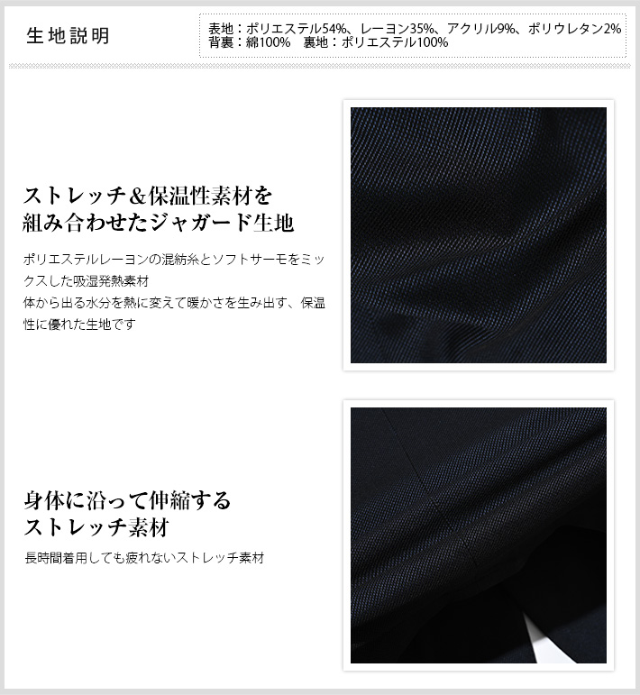HOMEITEM JACKETS ジャケット 秋冬 保温性に優れた吸湿発熱素材のストレッチジャケット[別売り セットアップパンツ 450509] 吸湿発熱素材 ソフトサーモ ストレッチ ジャケット テーラード 別売り セットアップ 450209 G-stage ジーステージ 価格: ¥20,900 (税込) 販売期間: カラー: 選択してください チャコールグレー ネイビー サイズ: 選択してください 44 46 48 50 数量: 枚 カラーサイズ在庫チャコールグレー44○46○48○50○ネイビー44×46○48○50○ __MEMBER_ID__ 吸湿発熱素材ソフトサーモストレッチジャケット450209 保温性に優れた吸湿発熱素材のストレッチジャケット吸湿発熱素材「ソフトサーモ」を使用した、暖かく快適な着心地のジャケット。体から出る水分を熱に変えて、じんわりと暖かさを生み出す吸湿発熱素材「ソフトサーモ」。軽くて、暖かく、蒸れにくい、優れた保温性で、寒い季節でも快適に過ごせます。伸縮性のある生地を組み合わせることで、窮屈感のないストレスフリーな着心地を実現。先染めの深みのある色合いで、品のある艶感がベーシックなデザインながら1着で顔立ちするジャケットです。着心地を重視したミニマルでライトな仕立てで、やや高めのゴージラインがスマートクラシックな面持ち。ベーシックなテーラードジャケットのデザインなので、ON-OFF自在に着回せるコストパフォーマンスの高さも魅力です。同素材のパンツ(品番:450509)と合わせて、よりドレッシーなセットアップスタイルもお楽しみいただけます。 ≫ 別売りセットアップパンツ(品番:450509)はこちら 生地の厚さ 薄いやや薄い普通やや厚い厚い 裏地 あり なし 透け感 あり なし 伸縮性 あり なし 光沢 なし ややあり お手入れ方法 当て布使用 お手入れ方法のアイコンについてフロント襟ベーシックなテーラードタイプ背裏生地と同生地のポケットチーフ付裏側上部背裏付き着心地の良さを重視したライトな仕立て両側に裏ポケット仕様袖/ポケットカジュアルな筒袖仕様両サイドにカジュアルなパッチポケットベント軽快に着用できるサイドベンツ サイズ肩幅 胸囲 着丈 袖丈 胴囲 裾囲 ラペル幅 44(S相当) 44 101 70 60.5 91 103 8.5 46(M相当) 45 104 70 60.5 94 106 8.5 48(L相当) 46 108 71 61.5 98 110 8.8 50(XL相当) 47 112 72 62.5 102 114 8.8 ※単位はcmです。※サイズ表より前後2cmは誤差の許容範囲とさせて頂いております。 サイズ表はこちら 吸湿発熱素材 ソフトサーモ ストレッチ ジャケット テーラード 別売り セットアップ 450209 G-stage ジーステージ 価格: ¥20,900 (税込) 販売期間: カラー: 選択してください チャコールグレー ネイビー サイズ: 選択してください 44 46 48 50 数量: 枚 カラーサイズ在庫チャコールグレー44○46○48○50○ネイビー44×46○48○50○ サイズ上のご注意点 サイズ表記は、商品本体のサイズになります。(ヌードサイズではございません) サイズにつきましては、お手元の衣類と本サイズを合わせて下さい。商品の素材等によっては、多少サイズに誤差が生じる場合がございます。当店では前後2cmは誤差の範囲内とさせて頂いておりますので、予めご了承くださいませ。 他にお困りでしたら当店までご連絡をお願いします。 在庫につきまして 当店では、実店舗 並びに自社サイトと在庫を共有しておりますので、オーダー受付後売り違いによる完売、欠品となってしまう場合もございます。 その際は、ご注文確認メール後に再度、当店よりご連絡させて頂きますことを予めご了承下さいませ。 商品画像について 商品画像の一部は、屋内照明の下で撮影していますので撮影商品画像と実際の商品と若干の色合いに違いが生じる場合がございます。 またコンピューターディスプレイの環境によっても異なる場合がございますので、予めご了承下さいませ。 関連商品 [WEB限定販売]在庫限り ミラノリブ ニットジャージ ジャケット パンツ G-ZERO カジュアルスーツ セットアップ 別売り 420215515 G-stage ジーステージ メーカー希望小売価格: ¥11,000(税込) ¥6,930(税込) 商品を見る