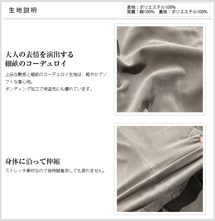 HOMEITEM PANTS パンツ 秋冬 軽量ソフトで上品な艶感が魅力のニットコーデュロイパンツ[別売り セットアップジャケット 450213] LEON掲載 コーデュロイパンツ ジャージ ボンディング ストレッチ 美脚パンツ コール天 セットアップ別売り 450513 G-STAGE ジーステージ 価格: ¥14,300 (税込) 販売期間: カラー: 選択してください ベージュ ネイビー ブラック サイズ: 選択してください 44 46 48 50 [裾上げ希望]: お裾上げ方法を下のプルダウンより選択ください。 お裾上げをご希望の方は、購入手続き画面の 「お裾上げ 股下サイズ」に股下サイズを合わせてご記入ください。 お裾上げ後の返品・交換はお受けできません。 仕上がりはご注文承諾より1週間程度お時間頂戴いたします。 ※お裾上げの必要がない場合は、「裾上げなし」をご選択ください。 選択してください 裾上げなし(¥0) デニム仕上げ(¥1,100) シングル仕上げ(¥1,100) ダブル仕上げ(¥1,100) 数量: 枚 カラーサイズ在庫ベージュ44○46○48○50○ネイビー44○46○48○50○ブラック44○46○48○50○ __MEMBER_ID__ ジャージボンディングストレッチコールパンツ450513 軽量ソフトで上品な艶感が魅力のニットコーデュロイパンツ軽くてシワになりにくいポリエステル素材にストレッチ性をプラスした、軽量でソフトな着心地が特徴のニットコーデュロイパンツ。細畝コールを採用することで、カジュアルすぎないドレッシーで洗練された大人の表情を演出します。裏地と表地の間に特殊な接着加工(ボンディング)を施すことで、コーデュロイの持つ立体感を強調しつつ、生地に適度なハリとコシ実現。ボンディング加工により、シャープで洗練されたシルエットを保ち、冷たい風を通しにくい防風性も兼ね備えました。シルエットは緩やかにテーパードを描く、美しく品ある美脚仕様で、生地を摘まんで縫い上げるプリーツ仕上を採用し、どんなに動いても消えない永久クリースラインを実現。同素材のジャケット(品番:450213)を合わせてセットアップでドレッシーにこなすはもちろん、シックなカラ―なので、キレイ目なジャケパンスタイルにも活躍します。クラシックとカジュアルを融合させたG-stageを象徴するアイコニックなパンツです。≫ 別売りセットアップジャケット(品番:450213)はこちら 生地の厚さ 薄いやや薄い普通やや厚い厚い 裏地 あり なし 透け感 あり なし 伸縮性 あり なし 光沢 なし あり お手入れ方法 スチーム浮かしアイロン お手入れ方法のアイコンについて フロントベルトループとドローコードホールが施された2WAY仕様バックスタイルスマートなバックスタイル腰ポケット両サイドにスラントポケットセンタークリースライン縫い上げて形成している永久プリーツ仕様アイコンプレートフラワーホールの下に蜂をモチーフにしたブランドアイコンプレート"fortunate bee" サイズウエスト 股上 股下 ワタリ幅 裾幅 ヒップ 44(S相当) 78 23 75 31 16 96 46(M相当) 82 23.5 75 32 16.5 100 48(L相当) 86 24 78 33 17 104 50(XL相当) 90 24.5 78 34 17.5 108 ※単位はcmです。※サイズ表より前後2cmは誤差の許容範囲とさせて頂いております。 サイズ表はこちら LEON掲載 コーデュロイパンツ ジャージ ボンディング ストレッチ 美脚パンツ コール天 セットアップ別売り 450513 G-STAGE ジーステージ 価格: ¥14,300 (税込) 販売期間: カラー: 選択してください ベージュ ネイビー ブラック サイズ: 選択してください 44 46 48 50 [裾上げ希望]: お裾上げ方法を下のプルダウンより選択ください。 お裾上げをご希望の方は、購入手続き画面の 「お裾上げ 股下サイズ」に股下サイズを合わせてご記入ください。 お裾上げ後の返品・交換はお受けできません。 仕上がりはご注文承諾より1週間程度お時間頂戴いたします。 ※お裾上げの必要がない場合は、「裾上げなし」をご選択ください。 選択してください 裾上げなし(¥0) デニム仕上げ(¥1,100) シングル仕上げ(¥1,100) ダブル仕上げ(¥1,100) 数量: 枚 カラーサイズ在庫ベージュ44○46○48○50○ネイビー44○46○48○50○ブラック44○46○48○50○ サイズ上のご注意点 サイズ表記は、商品本体のサイズになります。(ヌードサイズではございません) サイズにつきましては、お手元の衣類と本サイズを合わせて下さい。商品の素材等によっては、多少サイズに誤差が生じる場合がございます。当店では前後2cmは誤差の範囲内とさせて頂いておりますので、予めご了承くださいませ。 他にお困りでしたら当店までご連絡をお願いします。 在庫につきまして 当店では、実店舗 並びに自社サイトと在庫を共有しておりますので、オーダー受付後売り違いによる完売、欠品となってしまう場合もございます。 その際は、ご注文確認メール後に再度、当店よりご連絡させて頂きますことを予めご了承下さいませ。 商品画像について 商品画像の一部は、屋内照明の下で撮影していますので撮影商品画像と実際の商品と若干の色合いに違いが生じる場合がございます。 またコンピューターディスプレイの環境によっても異なる場合