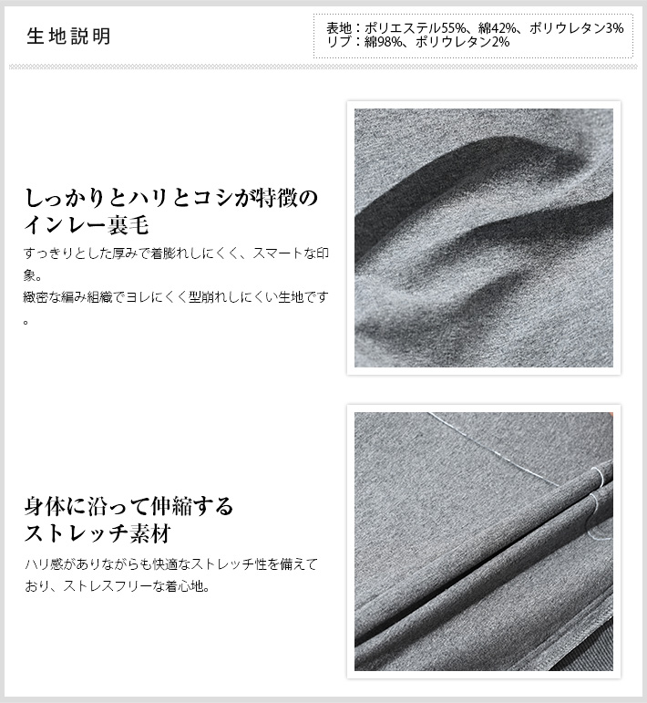 HOMEITEM PANTS パンツ 秋冬 スマートな厚みとハリ感が魅力、大人が纏うカジュアルウェア[別売り セットアップパーカー 450403] 高機能スウェットストレッチリブパンツ 450515 G-STAGE ジーステージ 価格: ¥15,400 (税込) [ポイント還元 154ポイント~] 販売期間: カラー: 選択してください ライトグレー ブラック サイズ: 選択してください 46 48 50 数量: 枚 カラーサイズ在庫ライトグレー46○48○50○ブラック46○48○50○ __MEMBER_ID__ 高機能スウェットストレッチリブパンツ450515 スマートな厚みとハリ感が魅力、大人が纏うカジュアルウェアしっかりとしたハリとコシが特徴のインレー裏毛生地を使用したイージーパンツ。カジュアルアイテムでありながら、緻密な編み組織でヨレにくく型崩れしにくいため、上品で立体感のある風合いが魅力です。ふっくらしているのにすっきりした厚みで、着膨れを抑えたスマートなシルエット。パンツのサイドは敢えて切りっぱなし風のデザインで繋ぐことで、絶妙なこなれ感と大人の遊び心をプラスしました。伸縮性の高いストレッチ素材でストレスフリーな履き心地。同素材のパーカー(品番:450403)と合わせて、セットアップスタイルもお楽しみいただけます。普段使いはもちろん、ワンランク上のリラックスウェアとして、心地良い着心地を是非お楽しみください。≫ 別売りセットアップパーカー(品番:450403)はこちら 生地の厚さ 薄いやや薄い普通やや厚い厚い 裏地 あり なし 透け感 あり なし 伸縮性 あり なし 光沢 なし あり お手入れ方法 洗濯の際ネット使用・無蛍光洗剤使用・当て布使用・液体酸素系漂白剤使用 お手入れ方法のアイコンについて フロントウエストはドローコードで調節可能リブ仕様で快適な着心地バックスタイル右後ろにジップファスナー付きポケット腰ポケット両サイドにジップファスナー付きポケット裾裾はソフトにフィットするリブ仕様インレー裏毛型崩れしにくくハリコシのある高機能スウェット素材 サイズウエスト 股上 股下 ワタリ幅 裾幅 ヒップ 46(M相当) 80 21.5 73 33 11 102 48(L相当) 84 22 75 34 11.5 106 50(XL相当) 88 22.5 75 35 12 110 ※単位はcmです。※サイズ表より前後2cmは誤差の許容範囲とさせて頂いております。 サイズ表はこちら 高機能スウェットストレッチリブパンツ 450515 G-STAGE ジーステージ 価格: ¥15,400 (税込) [ポイント還元 154ポイント~] 販売期間: カラー: 選択してください ライトグレー ブラック サイズ: 選択してください 46 48 50 数量: 枚 カラーサイズ在庫ライトグレー46○48○50○ブラック46○48○50○ サイズ上のご注意点 サイズ表記は、商品本体のサイズになります。(ヌードサイズではございません) サイズにつきましては、お手元の衣類と本サイズを合わせて下さい。商品の素材等によっては、多少サイズに誤差が生じる場合がございます。当店では前後2cmは誤差の範囲内とさせて頂いておりますので、予めご了承くださいませ。 他にお困りでしたら当店までご連絡をお願いします。 在庫につきまして 当店では、実店舗 並びに自社サイトと在庫を共有しておりますので、オーダー受付後売り違いによる完売、欠品となってしまう場合もございます。 その際は、ご注文確認メール後に再度、当店よりご連絡させて頂きますことを予めご了承下さいませ。 商品画像について 商品画像の一部は、屋内照明の下で撮影していますので撮影商品画像と実際の商品と若干の色合いに違いが生じる場合がございます。 またコンピューターディスプレイの環境によっても異なる場合がございますので、予めご了承下さいませ。 商品番号について 商品番号、カラー番号は生産管理上の番号でございますので、ネット上の番号とは異なる場合がございます。 商品ページ記載の番号と、商品の下げ札・ネームの番号が異なる場合でも、商品に間違いはございませんのでご安心ください。