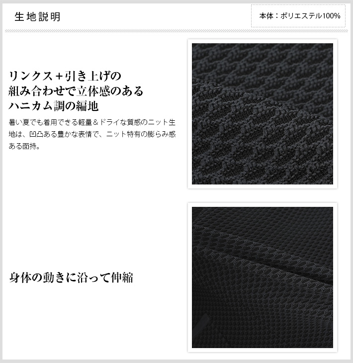 HOMEITEM PANTS パンツ 春夏 ハニカム編みの顔立ちする快適なサマーニットパンツ[別売り セットアップジャケット 540205] 【会員専用】 [会員様限定SALE] 在庫限り G-ZERO ハニカム サマーニット パンツ 軽量 ドライ ウォッシャブル 洗える 別売りセットアップ 540505 G-stage ジーステージ メーカー希望小売価格: ¥14,300(税込) 価格: ¥9,900 (税込) 30%OFF 販売期間: カラー: 選択してください ライトグレー チャコールグレー ネイビー サイズ: 選択してください 44 46 48 50 [裾上げ希望](シングル仕上げのみ): こちらのパンツは、生地の特性上、 シングル仕上げのみお裾上げが可能でございます。 ご理解の程、よろしくお願い致します。 お裾上げをご希望の方は、購入手続き画面の 「お裾上げ 股下サイズ」に股下サイズを合わせてご記入ください。 お裾上げ後の返品・交換はお受けできません。 仕上がりはご注文承諾より1週間程度お時間頂戴いたします。 ※お裾上げの必要がない場合は、「裾上げなし」をご選択ください。 選択してください 裾上げなし(¥0) シングル仕上げ(¥1,100) 数量: 枚 カラーサイズ在庫ライトグレー44○46○48○50○チャコールグレー44○46○48○50○ネイビー44○46○48○50○ __MEMBER_ID__ G-ZEROハニカムサマーニットパンツ540505 ハニカム編みの顔立ちする快適なサマーニットパンツ"大人が着る究極のシーンレスウェア"をコンセプトに作られたニットジャージパンツ。家⇔街、仕事⇔スポーツなど、1セットあれば、あらゆるシーンに着回せるのが魅力です。今季はリンクス+引き上げの組み合わせで立体感のあるハニカム調の編地を採用し、表情豊かに仕上げました。軽量&ドライでソフトな質感のサマーニット生地は、ニット特有の膨らみ感ある面持。スタイルが単調にならないのが魅力です。暑い夏でも着用できる軽量&ドライでソフトな質感のニット生地は、それぞれが豊かな表情で、ニット特有の膨らみ感ある面持。スタイルが単調にならないのが魅力です。快適なニットの着心地が魅力のサマーニットパンツは、生地の凹凸による肌との接地面積を減らし、サラリとした快適な着用感を実現しました。腰回りにゆとりを持たせた快適な履き心地ながら、緩やかにテーパードを描く美脚シルエットで、ニットパンツでも品良い面持になるのがポイントです。ウエストはベルトループとドローコードを配した2WAY仕様でON-OFF問わずに活躍。素材の特性上シワにならず、保形成があるので小さくたたんで携帯でき、旅行や出張にも最適です。また、デスクワークや、急なオンラインミーティングなどにも対応できるテレワークウェアとしても好適。ウォッシャブル仕様で家庭洗濯可能だから、デイリーにご着用いただけます。同素材別売りジャケット(品番:540205)、フーデッドブルゾン(品番:540404)と合わせてセットアップスタイルもお楽しみいただけます。≫ 別売りセットアップジャケット(品番:540205)はこちら≫ 同素材パーカー(品番:540404)はこちら 生地の厚さ 薄いやや薄い普通やや厚い厚い 裏地 あり なし 透け感 あり なし 伸縮性 あり なし 光沢 なし あり お手入れ方法 当て布使用 お手入れ方法のアイコンについて フロントベルトループとドローコードが配されたウエスト。ドローコードは内側に収納して結ぶことも可能バックスタイル右後ろにパッチポケットポケットポケット口には配色リブでアクセント裾裾にも配色リブアイコンプレート右前ポケットに"fortunate bee"のアイコンプレート サイズウエスト 股上(前/後) 股下 ワタリ幅(前/後) 裾幅 ヒップ 44(S相当) 66 19.5/32.5 70 24/34.5 14 92 46(M相当) 72 20/33 70 25/35.5 14.5 98 48(L相当) 80 20.5/33.5 72 26/36.5 15 106 50(XL相当) 88 21/34 72 27/37.5 15.5 112 ※単位はcmです。※サイズ表より前後2cmは誤差の許容範囲とさせて頂いております。 サイズ表はこちら 【会員専用】 [会員様限定SALE] 在庫限り G-ZERO ハニカム サマーニット パンツ 軽量 ドライ ウォッシャブル 洗える 別売りセットアップ 540505 G-stage ジーステージ メーカー希望小売価格: ¥14,300(税込) 価格: ¥9,900 (税込) 30%OFF 販売期間: カラー: 選択してください ライトグレー チャコールグレー ネイビー サイズ: 選択してください 44 46 48 50 [裾上げ希望](シングル仕上げのみ): こちらのパンツは、生地の特性上、 シングル仕上げのみお裾上げが可能でございます。 ご理解の程、よろしくお願い致します。 お裾上げをご希望の方は、購入手続き画面の 「お裾上げ 股下サイズ」に股下サイズを合わせてご記入ください。 お裾上げ後の返品・交換はお受けできません。 仕上がりはご注文承諾より1週間程度お時間頂戴いたします。 ※お裾上げの必要がない場合は、「裾上げなし」をご選択ください。 選択してください 裾上げなし(¥0) シングル仕上げ(¥1,100) 数量: 枚 カラーサイズ在庫ライトグレー44○46○48○50○チャコールグレー44○46○48○50○ネイビー44○46○48○50○ サイズ上のご注意点 サイズ表記は、商品本体のサイズになります。(ヌードサイズではございません) サイズ