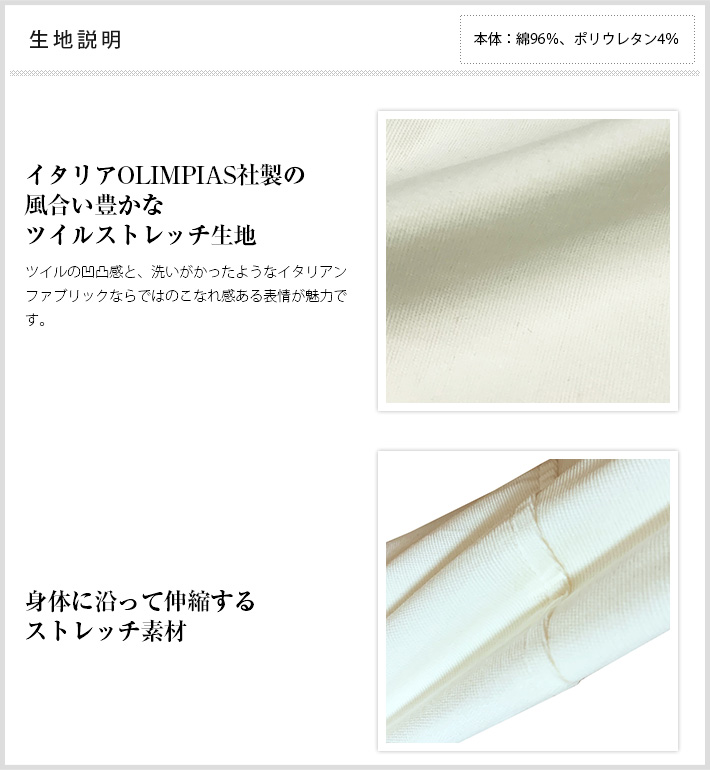 HOMEITEM PANTS パンツ 秋冬 風合い豊かなイタリアンファブリックツイルストレッチスラックス 【会員専用】 [会員様限定SALE]在庫限り ツイル ストレッチ ホワイト スラックス パンツ イタリア製生地 OLIMPIAS 630510 G-stage ジーステージ メーカー希望小売価格: ¥16,500(税込) 価格: ¥8,580 (税込) 48%OFF 販売期間: カラー: 選択してください ホワイト サイズ: 選択してください 44 46 48 50 52 [裾上げ希望]: お裾上げ方法を下のプルダウンより選択ください。 お裾上げをご希望の方は、購入手続き画面の 「お裾上げ 股下サイズ」に股下サイズを合わせてご記入ください。 お裾上げ後の返品・交換はお受けできません。 仕上がりはご注文承諾より1週間程度お時間頂戴いたします。 ※お裾上げの必要がない場合は、「裾上げなし」をご選択ください。 選択してください 裾上げなし(¥0) デニム仕上げ(¥1,100) シングル仕上げ(¥1,100) ダブル仕上げ(¥1,100) 数量: 枚 カラーサイズ在庫ホワイト44× 46○48○50○52○ __MEMBER_ID__ イタリア製OLIMPIAS生地 ツイルストレッチホワイトスラックス630510 風合い豊かなイタリアンファブリックツイルストレッチスラックス起毛感のあるふっくらとした肌感が特徴のイタリアOLIMPIAS社製コットンツイル生地のオフホワイトカラーのスラックス。ツイルの凹凸感と、洗いがかったようなイタリアンファブリックならではのこなれ感ある表情が魅力です。冬のホワイトパンツに相応しい上質で肉感ある生地感と、上品なオフホワイトカラーで、大人のキレイ目スタイルに好適です。緩やかなカーブを描くテーパードシルエットで、どんなスタイルにも合わせられるベーシックなデザインかつ、生地にストレッチ性があるので快適な履き心地。OLIMPIAS社は1982年創業、かつて綿工業が盛んだったイタリアベネチア地方をルーツとするファブリックメーカーで、豊かな素材感のコットン生地に定評があります。また、その生地は、撚糸から仕上工程までを内製化することで、高い品質管理がされています。 生地の厚さ 薄いやや薄い普通やや厚い厚い 裏地 あり なし 透け感 あり なし 伸縮性 あり なし 光沢 なし あり お手入れ方法 当て布使用 お手入れ方法のアイコンについて フロントボタン&ファスナーのシンプルなフロントバックバックポケットが2。釦シックなカラーの刻印入りボタンアイコンプレート左バックポケット上に、蜂をモチーフ にしたブランドアイコンプレート"fortunate bee"ポケット両サイドにスラントポケット サイズウエスト 股上 股下 ワタリ幅 裾幅 ヒップ 44(S相当) 78 21 75 29 16 91 46(M相当) 82 21.5 75 30 16.5 95 48(L相当) 86 22 78 31 17 99 50(XL相当) 90 22.5 78 32 17.5 103 52(XXL相当) 94 23 78 33 18 107 ※単位はcmです。※サイズ表より前後2cmは誤差の許容範囲とさせて頂いております。 サイズ表はこちら 【会員専用】 [会員様限定SALE]在庫限り ツイル ストレッチ ホワイト スラックス パンツ イタリア製生地 OLIMPIAS 630510 G-stage ジーステージ メーカー希望小売価格: ¥16,500(税込) 価格: ¥8,580 (税込) 48%OFF 販売期間: カラー: 選択してください ホワイト サイズ: 選択してください 44 46 48 50 52 [裾上げ希望]: お裾上げ方法を下のプルダウンより選択ください。 お裾上げをご希望の方は、購入手続き画面の 「お裾上げ 股下サイズ」に股下サイズを合わせてご記入ください。 お裾上げ後の返品・交換はお受けできません。 仕上がりはご注文承諾より1週間程度お時間頂戴いたします。 ※お裾上げの必要がない場合は、「裾上げなし」をご選択ください。 選択してください 裾上げなし(¥0) デニム仕上げ(¥1,100) シングル仕上げ(¥1,100) ダブル仕上げ(¥1,100) 数量: 枚 カラーサイズ在庫ホワイト44× 46○48○50○52○ サイズ上のご注意点 サイズ表記は、商品本体のサイズになります。(ヌードサイズではございません) サイズにつきましては、お手元の衣類と本サイズを合わせて下さい。商品の素材等によっては、多少サイズに誤差が生じる場合がございます。当店では前後2cmは誤差の範囲内とさせて頂いておりますので、予めご了承くださいませ。 他にお困りでしたら当店までご連絡をお願いします。 在庫につきまして 当店では、実店舗 並びに自社サイトと在庫を共有しておりますので、オーダー受付後売り違いによる完売、欠品となってしまう場合もございます。 その際は、ご注文確認メール後に再度、当店よりご連絡させて頂きますことを予めご了承下さいませ。 商品画像について 商品画像の一部は、屋内照明の下で撮影していますので撮影商品画像と実際の商品と若干の色合いに違いが生じる場合がございます。 またコンピューターディスプレイの環境によっても異なる場合がございますので、予めご了承下さいませ。