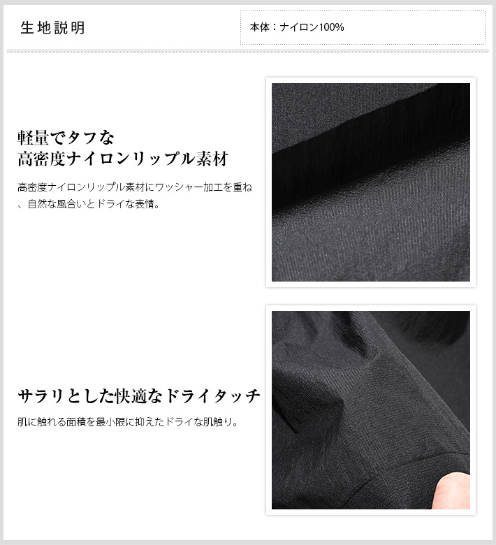 シャツ感覚で羽織れる圧倒的な軽量設計で、もともとのシワ感から小さく畳んで持ち運ぶことができ、旅行や出張にも重宝するアイテムです。