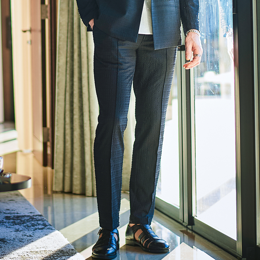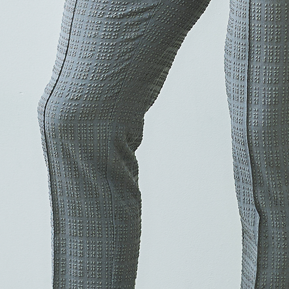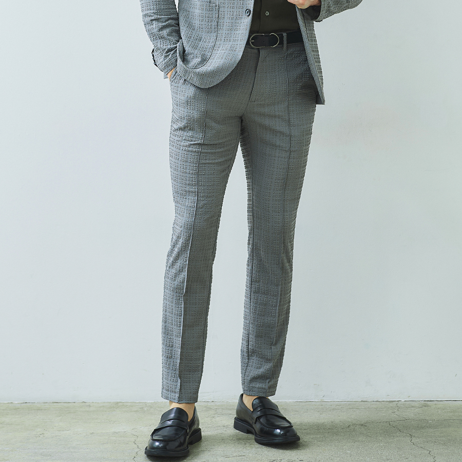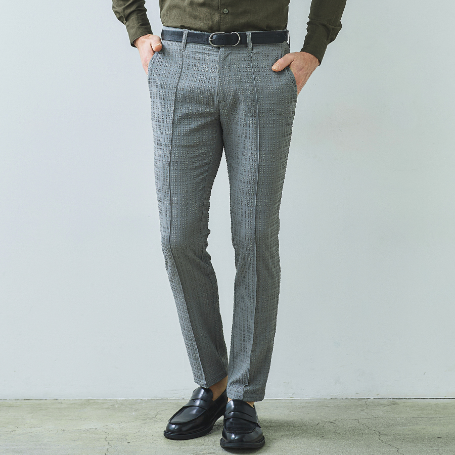 凹凸のあるブロックチェック柄が表情豊かなサッカー生地の清涼ストレッチパンツ