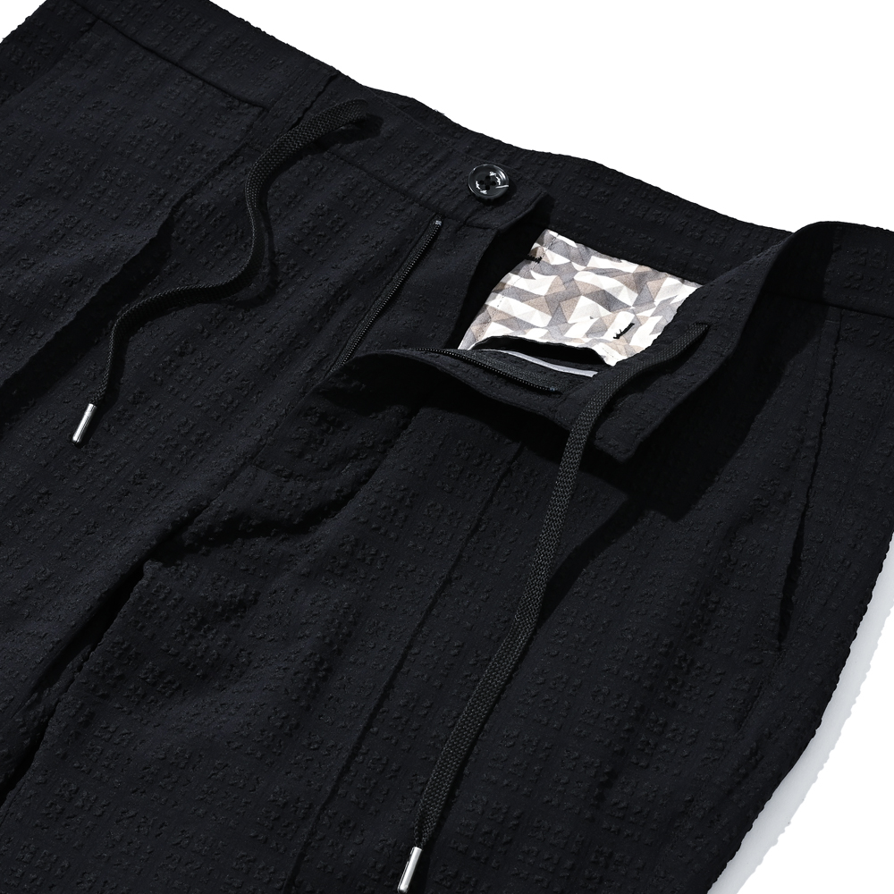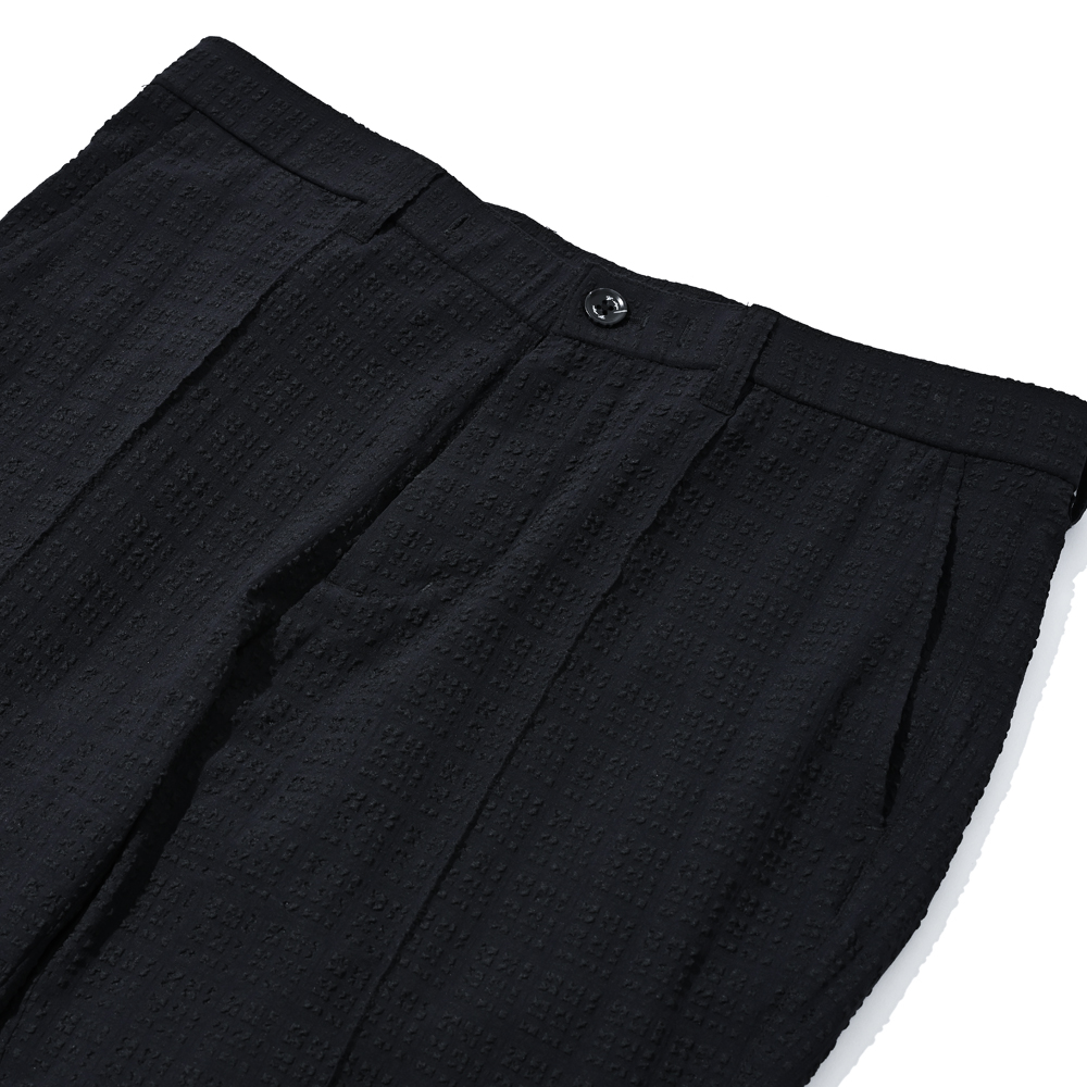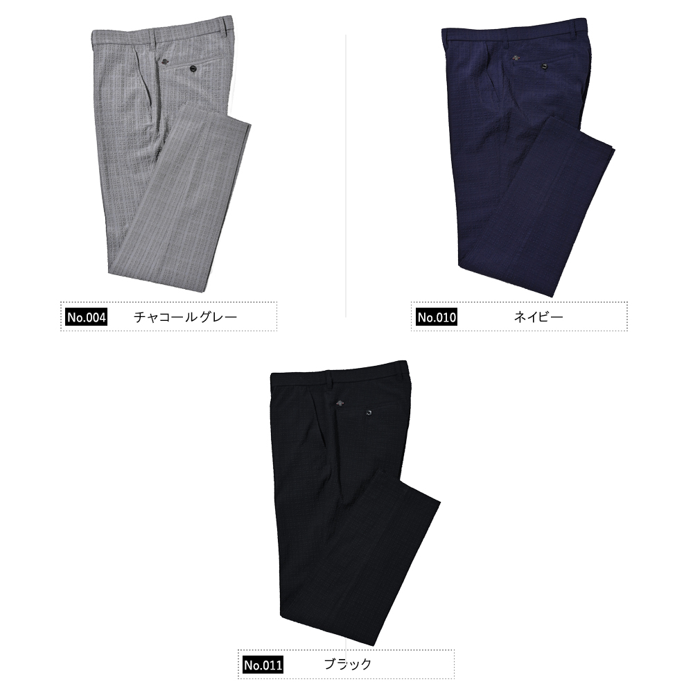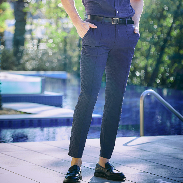 凹凸のあるブロックチェック柄が表情豊かなサッカー生地の清涼ストレッチパンツ