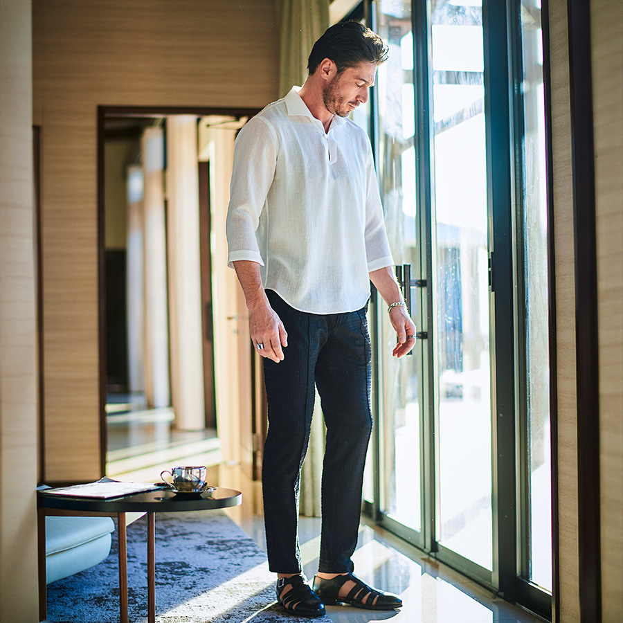パンツのウエストはドローコードとベルトループを配しているので、リラックススタイルからドレッシースタイルまでカバー。