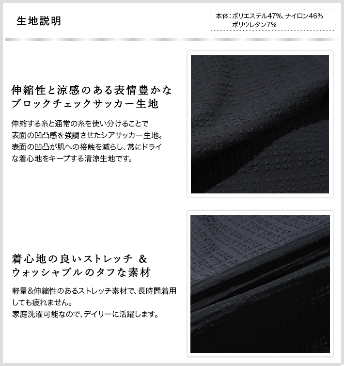 伸縮性のある生地で、暑い夏でも涼しく快適にご着用いただけます。