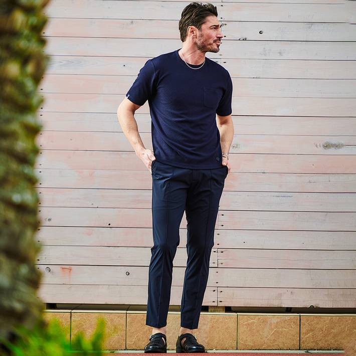 ウエストはストレッチインベル仕様で、スマートな見た目と快適さを両立。