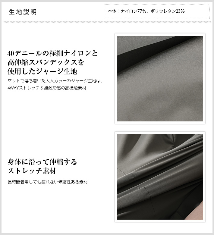 マットで落ち着いた大人カラーのジャージ生地は、4WAYストレッチ&接触冷感で快適な着心地。