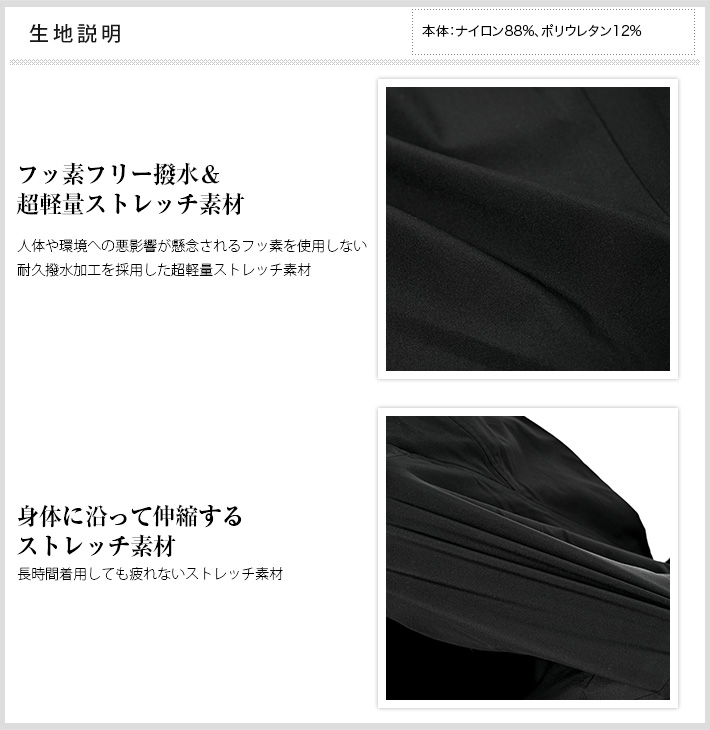 生地には人体や環境への悪影響が懸念されるフッ素を使用しない耐久撥水加工を施しているので、突然の小雨にも対応。